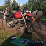 Am späten Nachmittag waren wir dann in Helsinki, die letzten Meter über die Autobahn. Beim ersten BMW-Händler bekamen wir unsere Teile, Glück gehabt. Leider habe ich meinen Zündschlüssel verbaselt. Alle Taschen abgesucht und nichts gefunden. Den Laden nochmal durchkämmt … nichts. Die Koffer und Taschen durchsucht – ich hatte zwischendurch meine Sonnenbrille und Volkers iPhone geholt. Nichts! Ich weis, ich hatte mir beim wegpacken des Schlüssels noch gedacht, da gehörst du nicht hin. Aber ich war durch irgendetwas abgelenkt. Also Zweitschlüssel rausholen. Den hatte ich meinem Ersatzteillager unter dem Tank deponiert. Wo ich jetzt so darüber nachdenke … keine gute Idee. War ziemlich mühsam die Sitzbank herunterzubekommen ohne Zündschlüssel. Und das ganze Gepäck musste auch runter. Aber der Zündschlüssel kam zu Tage und wir konnten nach dem Verstauen und Verzurren des Gepäcks die Fahrt wieder aufnehmen. Nächstes Ziel: Zeltplatz um den Wellendichtring einzubauen.