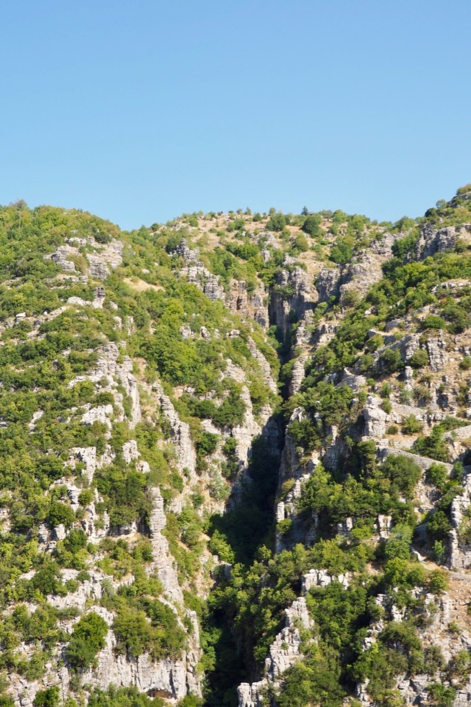 Und dann nähern wir uns der Vikos-Schlucht. „Die Schlucht ersteckt sich über eine Länge von knapp 10 km. Der Bach bzw. Fluss Vikos durchfließt die Schlucht und vereinigt sich am nördlichen Ausgang der Schlucht mit anderen Quellzuflüssen zum Fluss Voidomatis. Die Angaben über die maximale Tiefe der Schlucht differieren erheblich und schwanken zwischen 600 m und knapp 1.000 m. Im Guinness-Buch der Rekorde ist sie als tiefste Schlucht der Welt eingetragen, wobei das Verhältnis zwischen Tiefe und Breite als maßgebliches Kriterium definiert wurde.“ (Alles aus der Wikipedia)