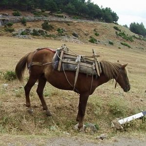 Warum die Pferde und Maultiere die eigentümlichen Gestelle auf dem Rücken tragen … ? Wir haben es auf den ersten 40km in Albanien häufig gesehen.