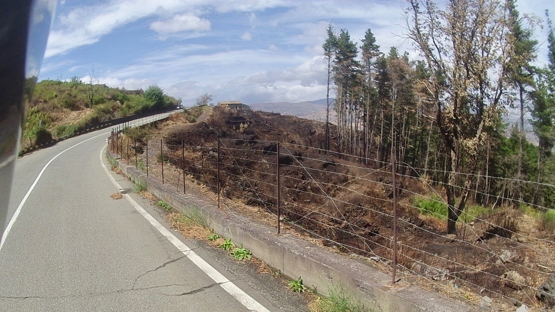 Wir umkreisen im weiteren Verlauf den Etna. Westlich vom Etna werden die Flächen für die Landwirtschaft genutzt. Überall Gemüseanbau und natürlich Oliven. Die Felder sind bis zur Straße mit hohen Zäunen gesichert. Vor wem … ? Als wir den Etna verlassen verändert sich die Landschaft. Sanfte geschwungene Hügel, überall geerntete Felder und immer wieder verbrannte Erde. Insgesamt gibt es aber es breites Spektrum an Farben, Formen und Strukturen. Sehr abwechslungsreich und überall findet man Fotomotive.