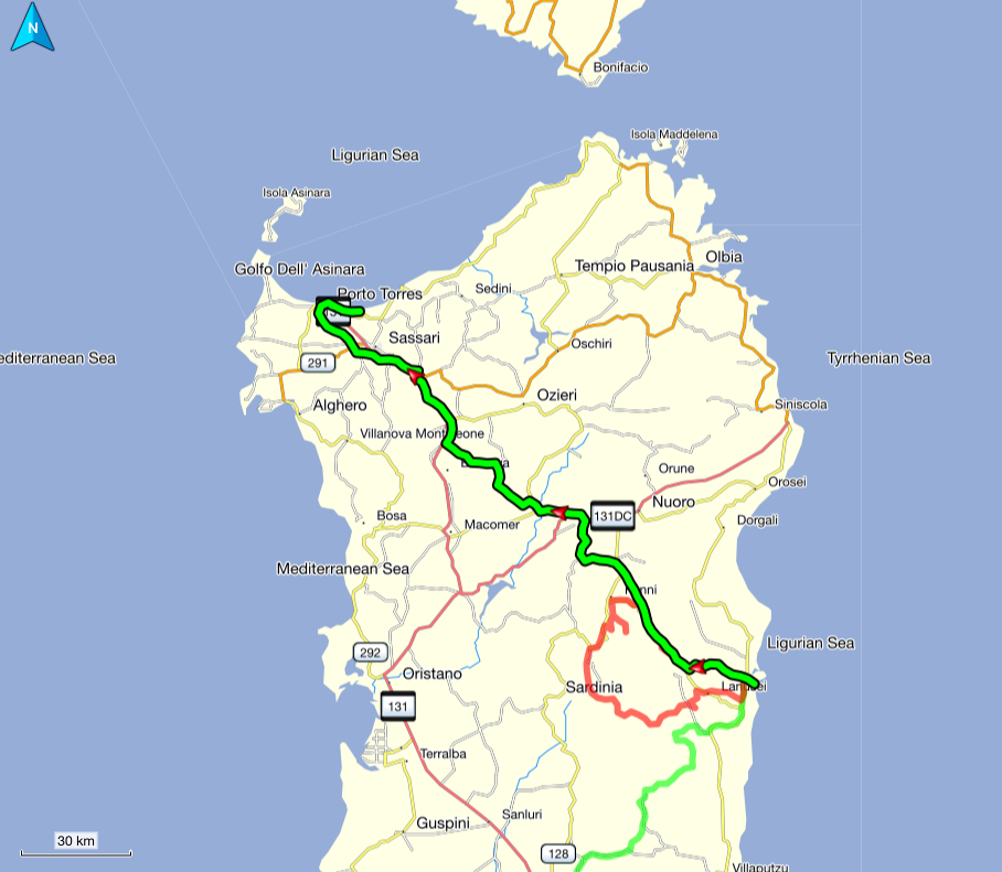 Auf unserer heutigen Tour hat sich nichts neues in der Landschaft ergeben. Ich habe Korsika landschaftlich wesentlich spannender in Erinnerung als ich jetzt Sardinien erlebe. Aber das liegt auch an meiner Neigung zu den Bergen, die Sardinien nicht so zu bieten hat. Badestrände hat Sardinien auf jeden Fall die Besseren!