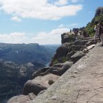 Schon um 9:30 waren wir auf der Strasse. Schon eine Stunde schneller als gestern, obwohl wir viel mehr Arbeit mit dem Windsicher abgespannten Zelt hatten. Heute wollten wir auf den Preikestolen besuchen. Das ist eine Klippe die rund 600m steil aus dem Fjord herausragt. 4h Wanderung hin und zurück sind dafür veranschlagt (wir haben natürlich nur 2:50 gebraucht). Der Ausblick da oben ist sensationell, da hat sich jeder Höhenmeter hinauf gelohnt. Ein sehr beindruckendes Schauspiel. Ich habe mich immer am Berg gehalten, Volker musste natürlich immer herunter gucken können. Aber seht selber.